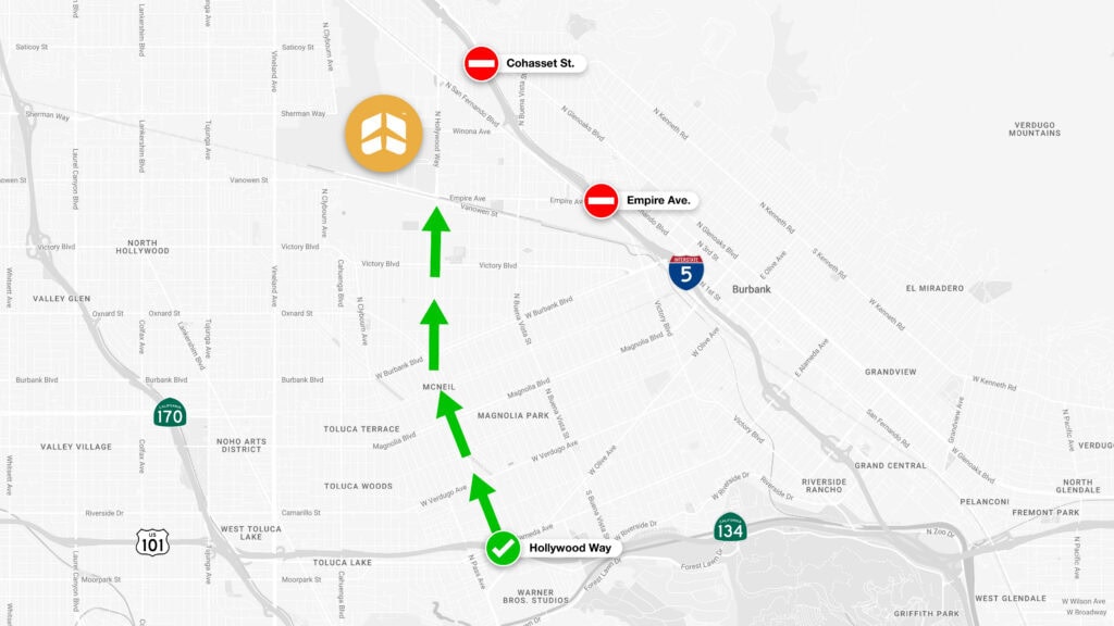 Travelers driving north to the airport are advised to use State Route 134 and exit at Hollywood Way.